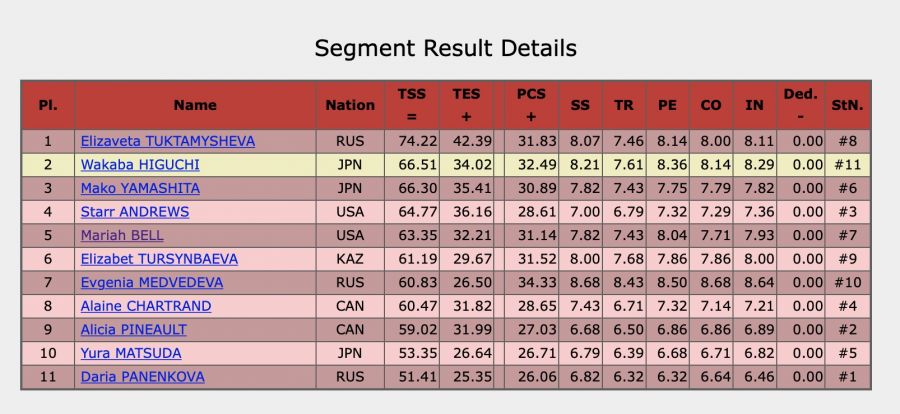 Олимпиаданың екі дүркін күміс жүлдегері, екі дүркін әлем және Еуропа чемпионы Евгения Медведева мәнерлеп сырғанау кезінде жығылып, 60,83 ұпайға ие болды. Нәтижесінде Элизабеттен кейін 7-орында келеді.