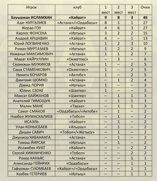 Сауалнама қорытындысы бойынша «Қайрат» футбол клубының жартылай қорғаушысы Бауыржан Исламхан жылдың үздік футболшысы атанды. Ол барлығы 46 ұпай жинады. Екінші орынға тұрақтаған Азат Нұрғалиевтен 19 ұпайға артық жинаған. Ал Азат пен Жерар Гоу 27 ұпайдан еншілеген. Бірақ, Азатты үздік деп танығандар 8 адам болса, Гоуды бірінші орынға тек төрт-ақ респондент қойған.