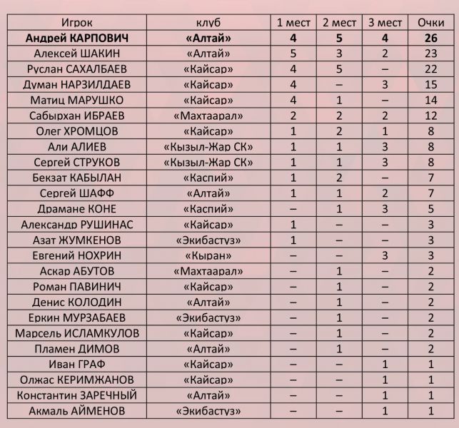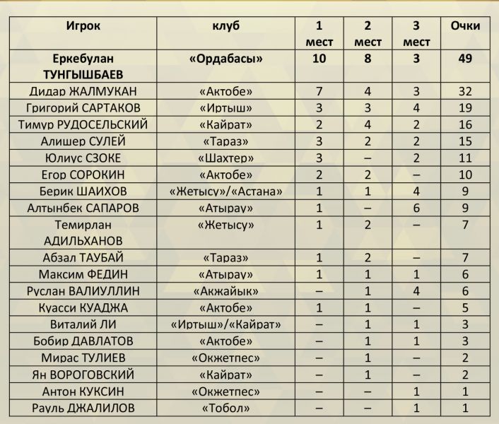 Қазақстан кәсіпқой футбол лигасы жылдың үздік ойыншысы, ең жас ойыншысы мен жаттықтырушысын ғана анықтап қоймай, жылдың үздік құрамын да жариялады. Бұл құрамға 22 футболшы енген.