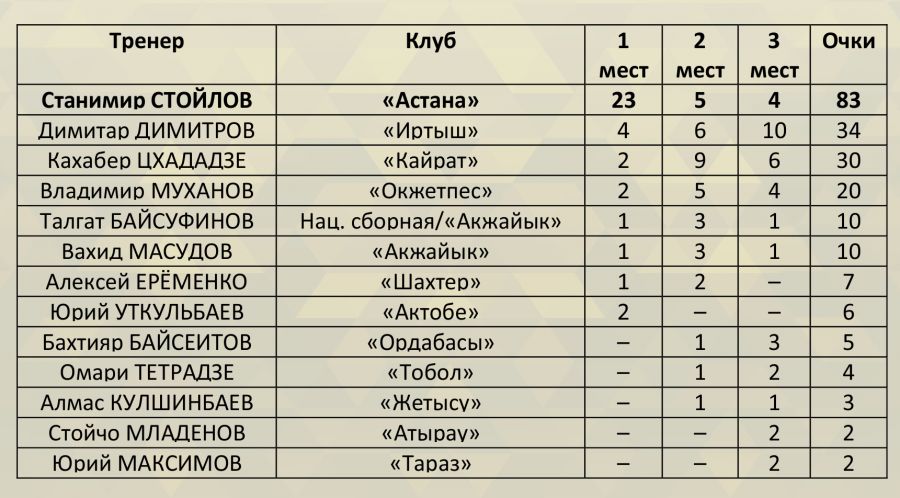 Жылдың үздік жаттықтырушысы ретінде сөзсіз Станимир Стойлов танылды. Дауыс берген 36 респонденттің 23-і «Астана» клубының жаттықтырушысын бірінші орынға қойған. Қорытындысында 83 ұпаймен өзгелерден көш ілгері тұр. Екінші орынға да болгар елінің жаттықтыушысы орналасқан. «Ертісті» жаттықтыратын Димитар Димитров 34 ұпай иеленген. Үштікке «Қайраттың» бас жаттықтырушысы Кахабер Цхедадзе (30 ұпай) енген. Ал отандық жаттықтырушылардан Талғат Байсуфинов бар болғаны 10 ұпаймен бесінші орынға тұрақтаған.