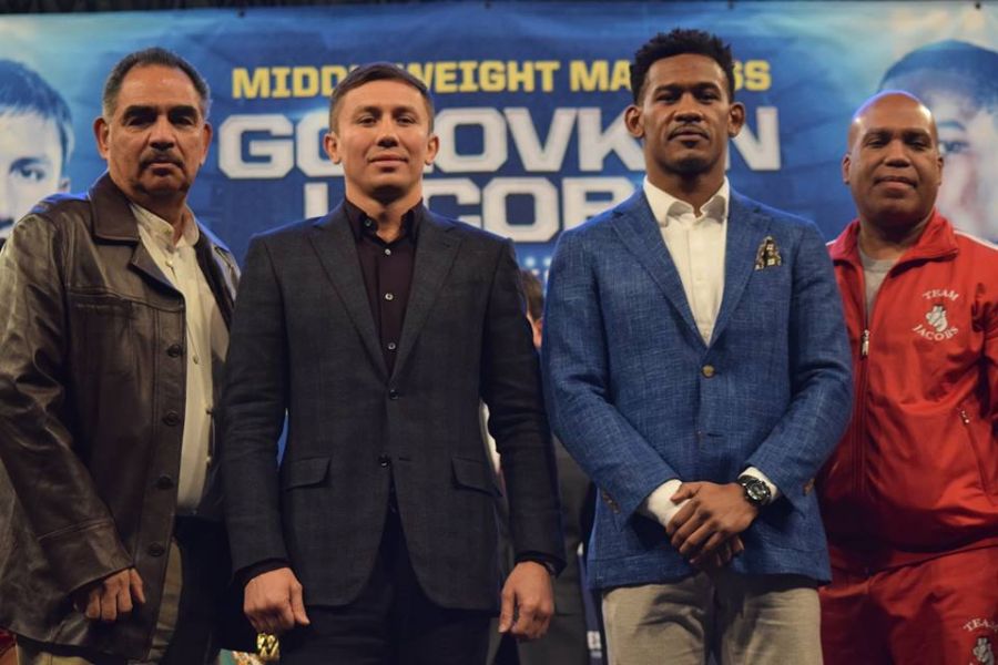 MSG аренасын "Бокс Меккесі" деп атайтын Джоэл Фишер Головкиннің бокс кеші Нью-Йоркта, ал дәлірек, Madison Square Garden шаршы алаңында ұйымдастырылып отырғанына қуанышты екенін білдірді. Екі боксшының да бірдей қолдаушысы екенін айтқанымен, жиын соңында тек Головкинмен ғана жеке суретке түсіп алды. Питер Нельсон, HBO арнасы директорының орынбасары, Джейкобсқа Бруклин көшелерінде өскендіктен, баскесерлерден қорғану үшін спортқа бару міндет болғанын айта кетіп, Головкиннің де Бруклиннен кем түспейтін жерде қауіпті кезеңде ер жеткенін ескере кетті. Ол КСРО ыдыраған кездегі Қазақстан жағдайының Головкин осындай спорттық мансабқа жету мүмкіндігін тудырғанын айтып өтті. "Головкинмен жекпе-жекке шыққан боксшылардың барлығы көбіне не қорғанатын, не шабуылға үнемі шығатын. Ал Джейкобс екі стильді де қолданады. Алдын ала болжау өте қиын. Нәтижесін бірге 18 наурызда көреміз," - деді HBO өкілі. Баспасөз жиынын, әдеттегідей, бокс кеші сынды, Майкл Баффер ашып берді. Содан кейін баспасөз жиынын Том Лоэффлер жүргізіп отырды.