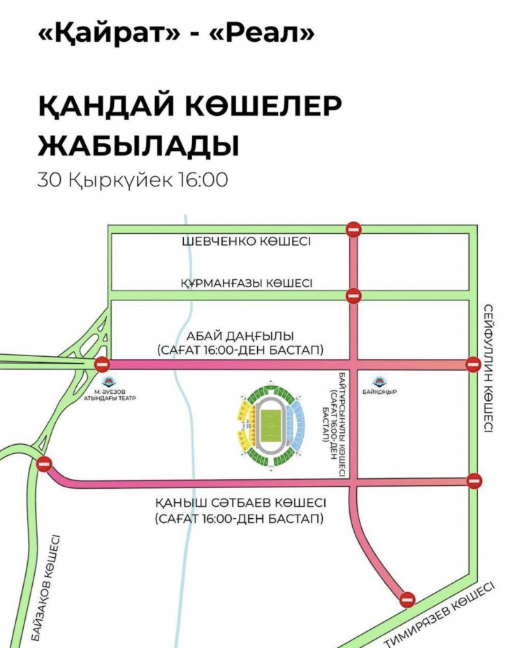 Алматы полициясы бүгін жол қозғалысы шектелетінін ескертті. Орталық стадион маңында көлік қозғалысына уақытша шектеулер енгізіледі.