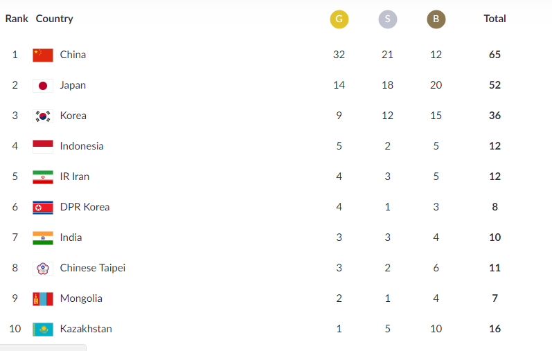 Қазіргі таңда Қазақстан құрамасы 1 алтын 5 күміс 10 қола медальмен жалпы есепте 10-орында келеді. Бүгінгі жарыс бағдарламасы әлі аяқталған жоқ. Алдағы уақытта Индонезия жерінен қуанышты хабарлар күтеміз.