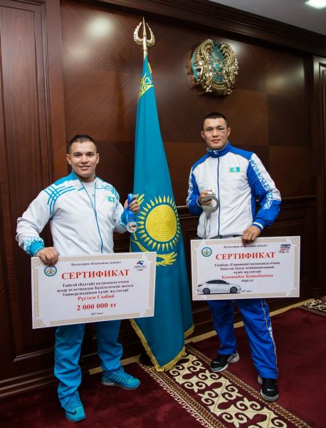Қырымбек Көшербаев Германия мен Қытайда өткен жарыстардың күміс жүлдегерлерімен кездесті. Халықаралық жарыстарда жүлделі орындарға қол жеткізгені үшін облыс әкімі Қамшыбек Қоңқабаевқа көлікке сертификат, ал Рүстем Сыбайға - екі миллион теңгенің сертификатын, жаттықтырушылардың әрқайсысына 500 мың теңгеден табыс етті.