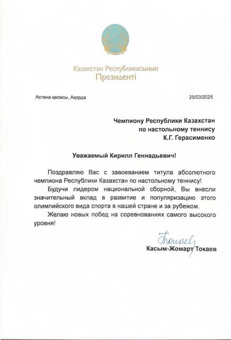 Теннисші Кирилл Герасименко Президент Қасым-Жомарт Тоқаев өзін Қазақстанның абсолют чемпионы атағына ие болуымен құттықтағанын жеткізді, - деп хабарлайды Massaget.kz тілшісі.
