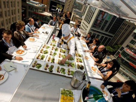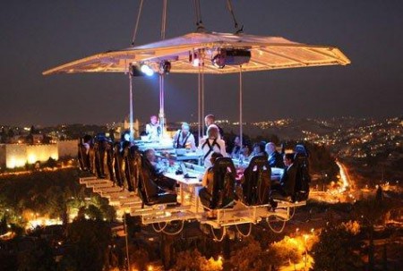 Асылған үстелде бір мезгілде 22 адам тамақтана алады. Келушілерге үстелдің ортасына орналасып алған қолдарынан бал тамған үздік 6 аспаз қызмет көрсетеді. Ал егер сүйіктіңізбен романтикалық кешкі ас ішкіңіз келсе, тіптен жақсы. Әдемі безендірілген дастархан жайылып, гүл шоқтары қойылады да, жанды дауыста ән салатын музыканттар екінші кранның көмегімен биікке көтеріледі.