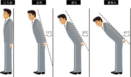 - Сәлемдесу - эсяку 会釈, 15 градус. Бұлай қоғамдағы жағдайы бірдей кісілер амандасады. Олар жақсы таныс болғанмен, жай бас изей сала алмайды.
