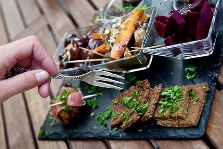 Дәмхана мәзірінде зәйтүннен, балқарағай жаңғақтарынан жасалған салаттар, жаңғақ майынан әзірленген ұнсыз нан, қақталған арқан балық пен түрлі шөптерден, аңдардың, балықтардың еттерінен жасалған ыстық тағамдар бар. Аталған мәзірдің қатарына қантсыз бәліштер мен асқабақ торттары енеді.