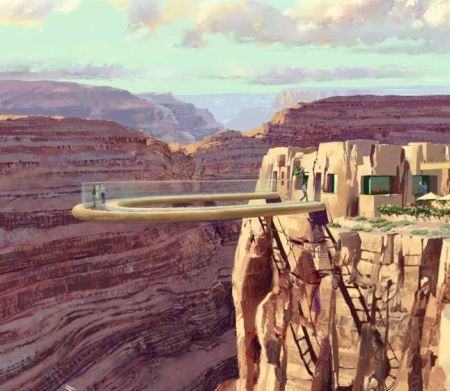 Grand Canyon Skywalk – әйнек едені бар алаңқай Гранд шатқалында ілініп тұр. Бұл еденмен жүру кәдімгідей ерлікті талап етеді.