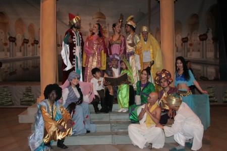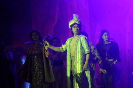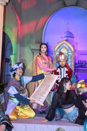 Шымылдық ашылғаннан көз алдымызда сәулеті келіскен сарай пайда болып, құлағымызға шығыс сазы келді. Спектакльдің атын естігеннен-ақ осындай декорацияны өзіміз де елестетіп қойғанбыз. Ертегі болғасын «Бір баяғыдасыз» болушы ма еді? Оқиғаның жай-жапсарын түсіндіріп, сахнада ертегіні бяндаушы әңгімесін бастады. Ертегінің өзгелерден өзгешелігі көп емес. Басқа ертегілер секілді «Шығыс хикаясы» да жағымсыз кейіпкердің дегенін болғызбай, жағымды кейіпкерді «мақсат-мұратына» жеткізеді. Бірақ біздің көргеніміз – сахналық қойылым, ал оның авторы – қоюшы режисер. Сондықтан ертегі жайлы емес, спектакль жайлы сөйлесек деп отырмыз.