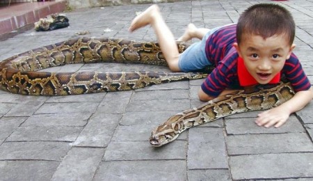 Қытайдың Хай Нан аралының тұрғыны Хуаң Кэй Ниңнің ауырлығы 100 қадақ болатын анаконда баққанына ұзақ жылдар болған. Бұл сүркейлі жылан бағбанның ұлы туылғаннан бастап жақын дос боп кеткен. Тіпті ата-анасы үйде жоқ күндері бұл жылан табиғи «бала бағушыға» айналып, оның қауіпсіздігіне кепілдік етеді екен. Былай қарағанда ертегі секілді болғанымен, екеуінің достығы шынында да таңғаларлықтай. Оның ұлы біресе жыланға мініп алып, біресе алысып ойнайтын көрінеді.