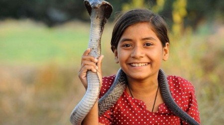 Мына суреттегі индиялық бүлдіршін қыз Каджол Хан «жылан тілін білетін қыз» атанған. Ол өзі баққан жыландармен ғана емес, бейтаныс, адамға үйретілмеген улы жыландармен де жақын дос боп кете барады. Ол тіпті осы жыландармен ойнау үшін сабақтан да қашып кететін күндері болады екен.