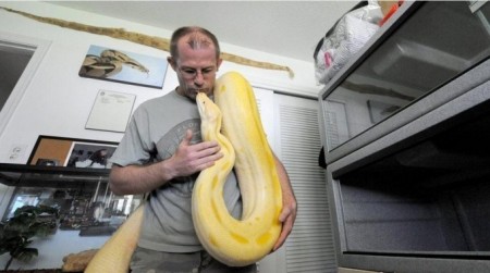Эдвард Мерсера өзі баққан алып жыланмен бірге. 2012 жылы 24 наурыз