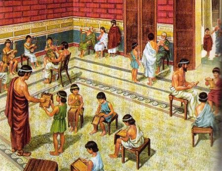 Бастапқы кезеңдегі білім беру жүйесі бойынша, бір ұстаз бір ғана шәкіртті оқытатын болған. Ділмарлар мен философтар шәкірттеріне физика, математика, биология саласындағы жаңалықтарды жеткізу үшін бүгінгідей сыныптарда оқытпай, әр түрлі мекендерге саяхатқа шығаратын болған екен.